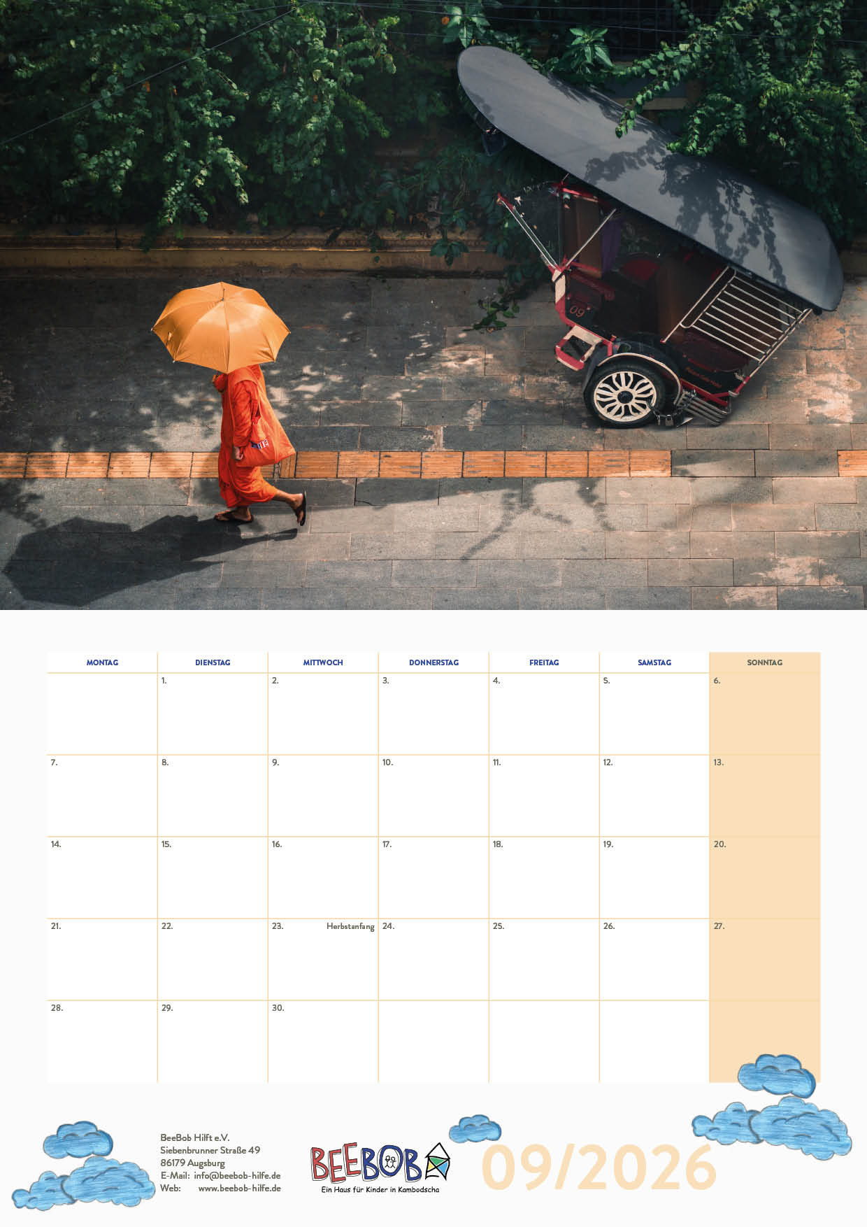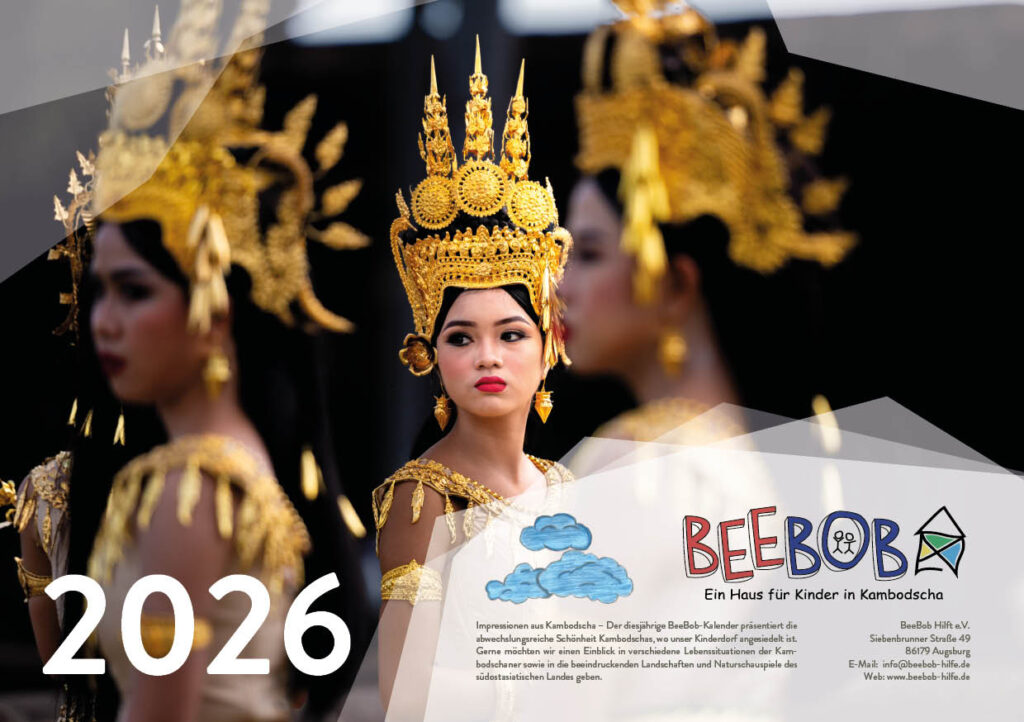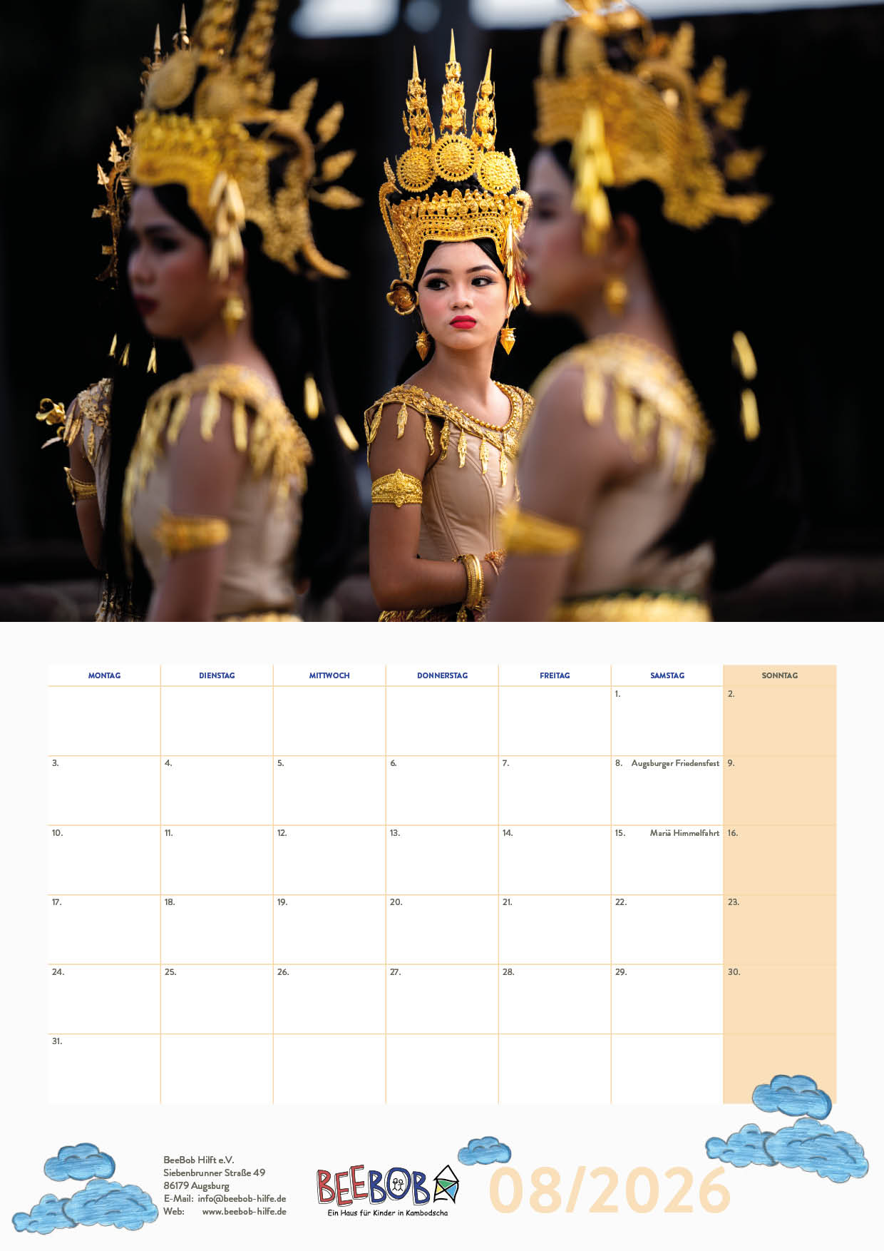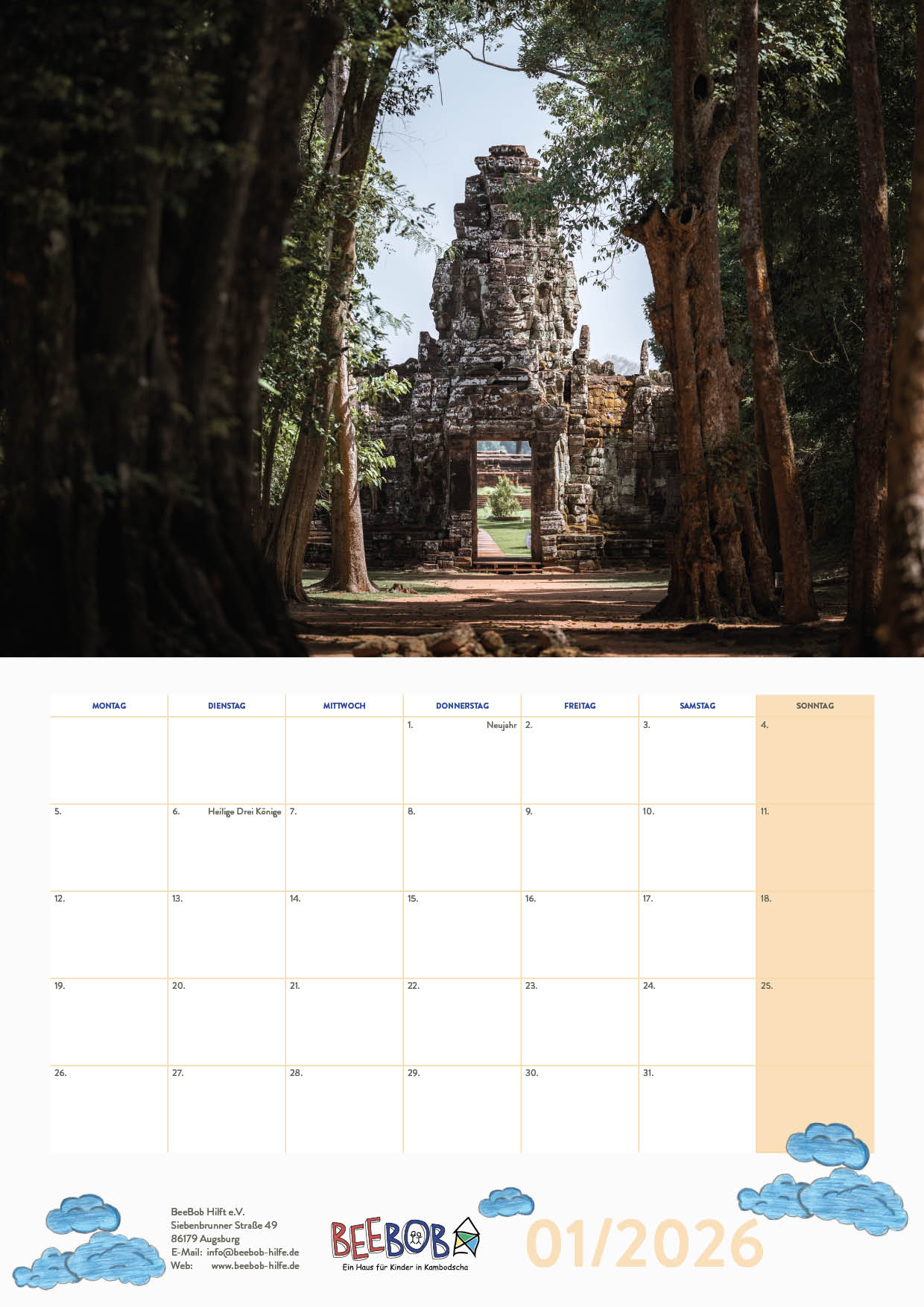 Die Bilder entstanden während der vergangenen BeeBob-Reisen. Morgendliche Tempelszenen bei Angkor Wat, Händlerinnen, die auf dem Markt ihre Waren anpreisen, weite Blicke in die beeindruckende Landschaft von Südostasien: der Kalender zeigt auch in diesem Jahr wieder viele verschiedene Aspekte des kambodschanischen Alltags.