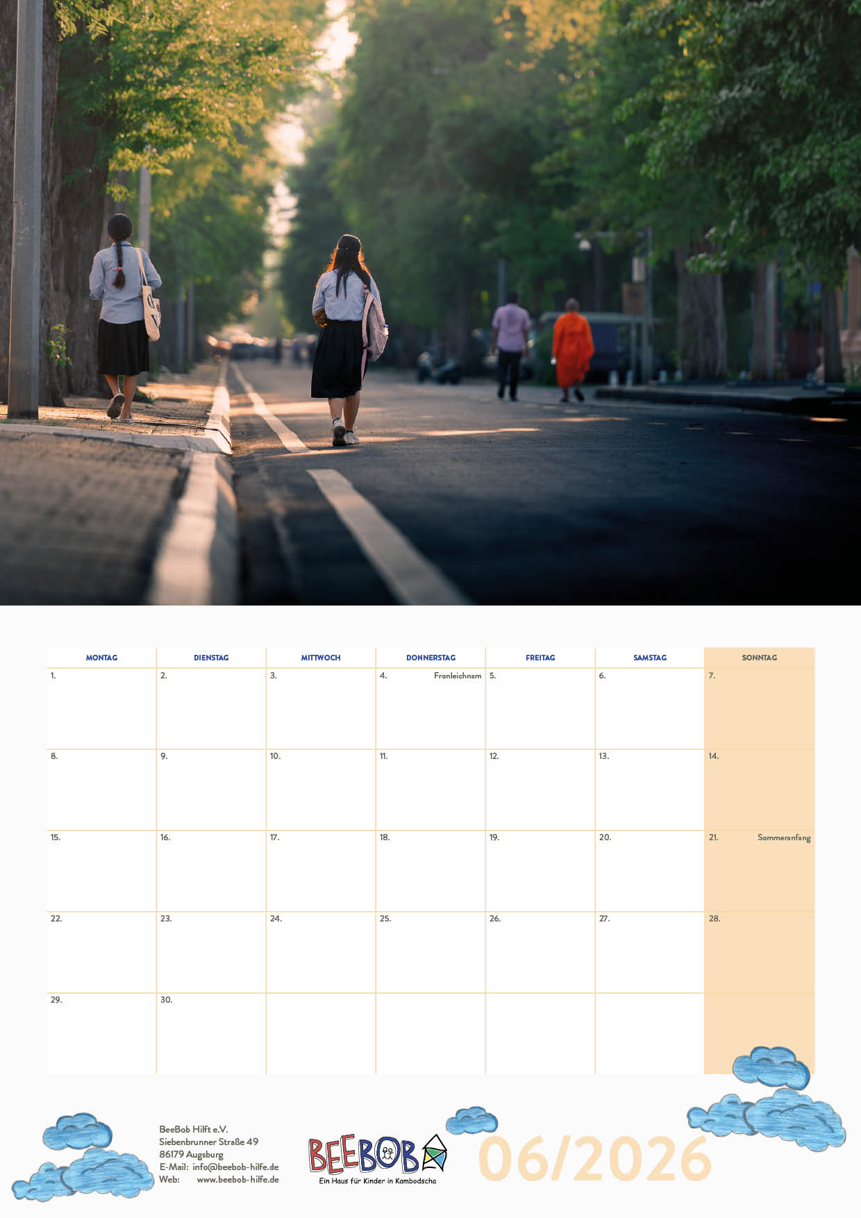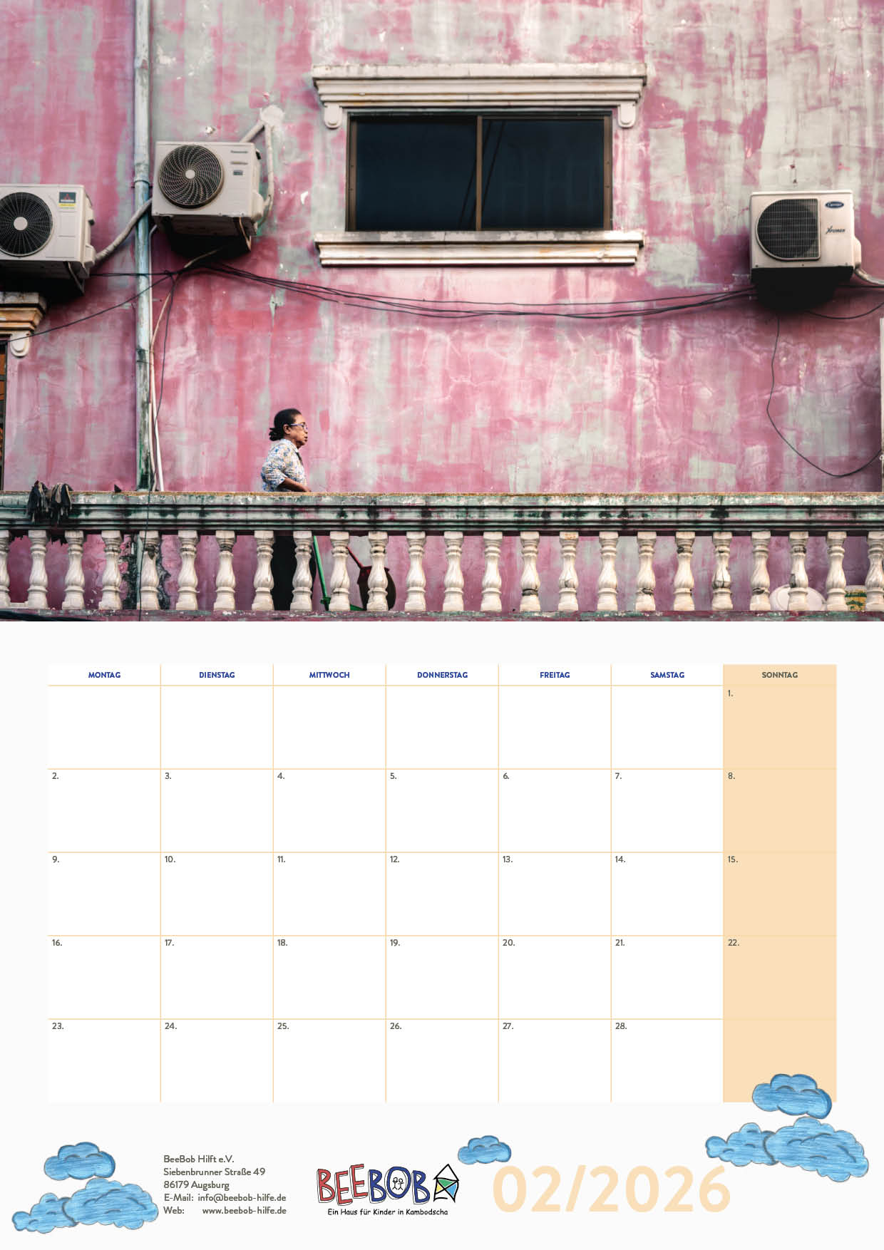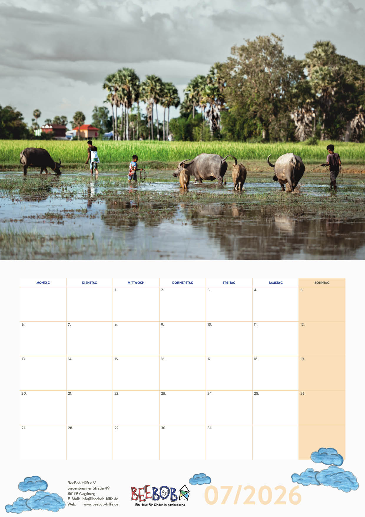 Die Bilder entstanden während der vergangenen BeeBob-Reisen. Morgendliche Tempelszenen bei Angkor Wat, Händlerinnen, die auf dem Markt ihre Waren anpreisen, weite Blicke in die beeindruckende Landschaft von Südostasien: der Kalender zeigt auch in diesem Jahr wieder viele verschiedene Aspekte des kambodschanischen Alltags.